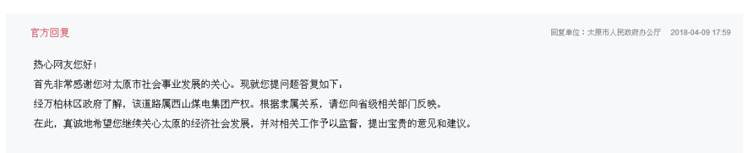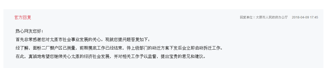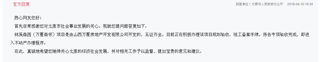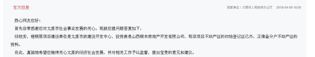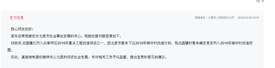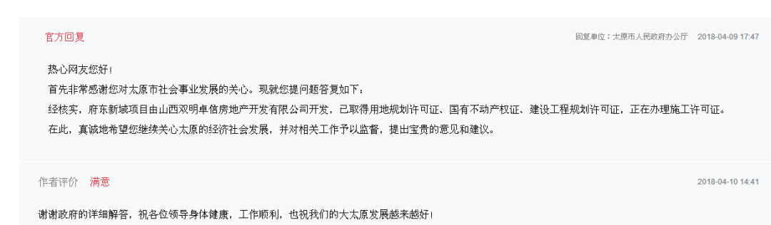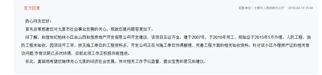 市民咨询:杏花岭大同路德祥六院的房产问题? 市民咨询:面粉二厂回迁,说好三年回迁,目前二厂还是没有任何开工迹象,政府有啥应对办法,是否改地方安置? 市长答复:和佳世纪柏林小区由山西和佳房地产开发有限公司开发建设,该项目五证齐全,建于2007年,于2010年完工,规验证于2015年5月办理。人防工程、消防工程未验收,因项目开工早,涉及施工单位的工程资料多,开发公司正在与施工单位协调整理、完善工程方面的相关验收资料。针对该小区办理房产证的相关信访问题,市信访局已多次协调,目前此项工作正积极向前推进。 市长答复: 经核实,北固碾已列入尖草坪区2018年重点工程改造项目之一,因太原市暂未下达2018年城中村改造计划,现北固碾村暂未确定是否列入2018年城中村改造范围。 市长答复:经核实,该费用并不是物业费,而是绿地费,是人行单位自己收取,社区也在人行宿舍办公,也向人行交绿地费。该物业为蓝泰物业,已备案。该小区属于后勤管理,本单位职工不收费,外单位收取一些垃圾、绿地费。市民咨询:大同路赵庄新北区计划拆迁吗 ? 市长答复:经万柏林区政府了解,该道路属西山煤电集团产权。根据隶属关系,请您向省级相关部门反映。 晋中26个市直机关遴选公务员43人 今日头条、凤凰新闻等4大新闻资讯类APP今起下架!