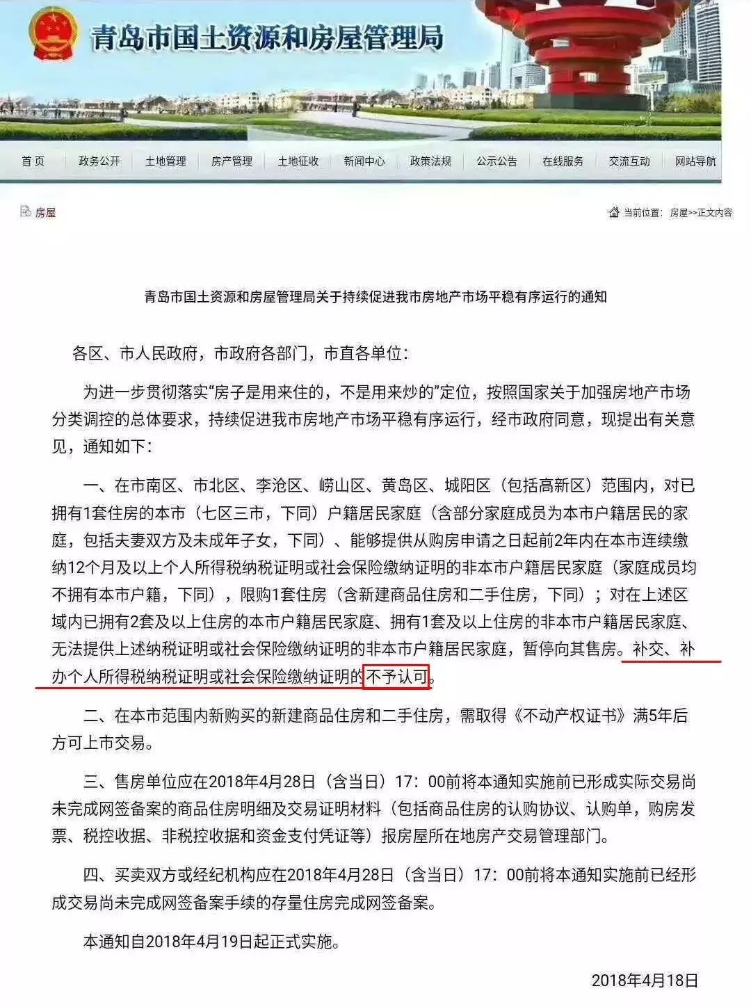 原标题:最新消息!关于青岛楼市新政,刚刚发布了几个重点事项说明,你关心的全在里面了! ●心疼!青岛1岁宝宝咽喉严重受伤,差点窒息!不得已切开气管!原因值得所有家长警惕… 势必有很多人会咨询 5政策缓冲期不管是一手住房还是二手住房,该文件正式实施前已经形成事实交易的购房者切莫恐慌,政策给予了缓冲期。 可以的 这次新政中规定 那么问题来了 ●山东5岁男孩掉进百米深井!14小时,多台挖掘机连夜大救援!终于救上来了,孩子却走了… 补缴的社保,不能买房 1关于购房套数本地居民家庭(含未成年子女)最多可购买两套住房,由之前的第三套住房不予贷款升级为不得购买第三套住房。 ◆编辑:陈小小 4月18日,《青岛市国土资源和房屋管理局关于持续促进我市房地产市场平稳有序运行的通知》发布。 在4月28日17点之前,只要将新建商品住房事实交易证明材料通过售房单位报不动产登记中心备案、二手住房完成网签备案就可按原政策执行,切勿到不动产登记大厅扎堆办理业务。 最新消息 新购买的新建商品住房和二手住房,自取得不动产登记证书之日起5年之内不得上市交易,限售时限由2年升级为5年。 无工作单位的灵活就业人员 很多人都关心新政实施细则 4已买未签的二手房对于该文件正式实施前形成事实交易但未网签的二手住房,买卖双方或经纪机构,应在2018年4月28日(含当日)17:00前将本通知实施前已经形成交易尚未完成网签备案手续的存量住房完成网签备案。 3已买未签的新房对于该文件正式实施前形成事实交易但未网签的新建商品住房,售房单位应在2018年4月28日(含当日)17:00前将形成实际交易尚未完成网签备案的商品住房明细及交易证明材料(包括商品住房的认购协议、认购单,购房发票、税控收据、非税控收据和资金支付凭证等)报房屋所在地不动产登记中心。 补交、补办社会保险 再划一个重点 可以的 将社保缴费与购房资格进行挂钩 发布了几条温馨提示 ▲点击图片可以查看通知全文 ◆半岛都市报微信(ID:bandaobao),半岛全媒体记者 于红靓,青岛西海岸新区不动产登记中心,青岛12333 西海岸新区不动产登记中心 补缴多久不能买房▼灵活就业人员个人缴费标准 |