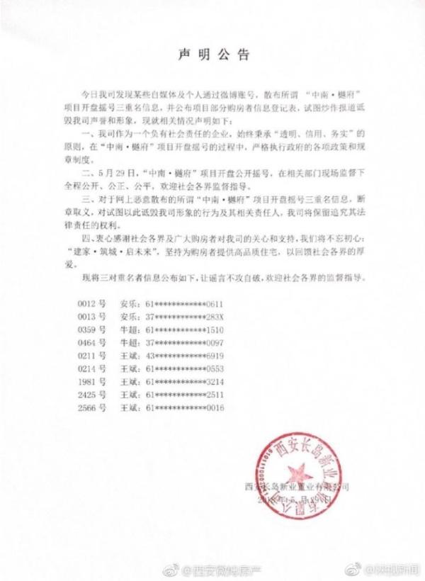 西安一楼盘摇号现多组重名者 开发商:409人次重名