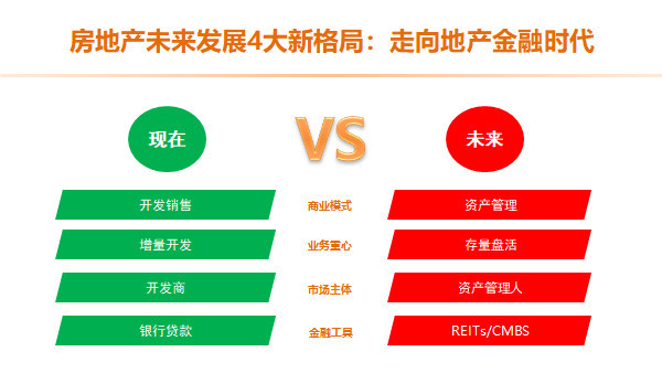 所以,政策驱动资产证券化加速演讲,而资产证券化将重塑房地产商业模式,资管春天即将来临。 从“增量开发”到“存量盘活” 当然在中国,CMBS有巨大的空间,中国有60万亿的商业物业的价值,美国的渗透率达到了20%,中国未来的市场应该也是一个10万亿的市场,这是一个特别大规模的市场,所以CMBS作为REITs配套的融资工具一定是未来的发展方向。 房地产未来发展四大新格局:走向地产金融时代 资管云 2018-03-03 但是现在传统的开发销售模式越来越面临挑战,这主要表现在三个方面:第一,房地产销售“六限”严重制约了高周转,尤其是开发自持要求更是沉淀了大量资金,严重拉了资金周转效率的后腿,第二,土地成本不断上升,加之价格备案管制给高毛利带来双杀,而政策的去杠杆要求,尤其2018年融资形势的趋紧,更是让高杠杆模式风险凸显。 从政策解读层面来看,政府希望房地产从原来的“交易-流量”模式转向“持有-运营”模式,从依靠价差获利转为扎扎实实的运营,租金获利,并且通过REITs手段,解决租赁模式下持有运营资金瓶颈问题,也让具备专业运营能力的轻资产管理公司有机会脱颖而出,借助社会化资本扩大管理规模,获得更高回报。 |