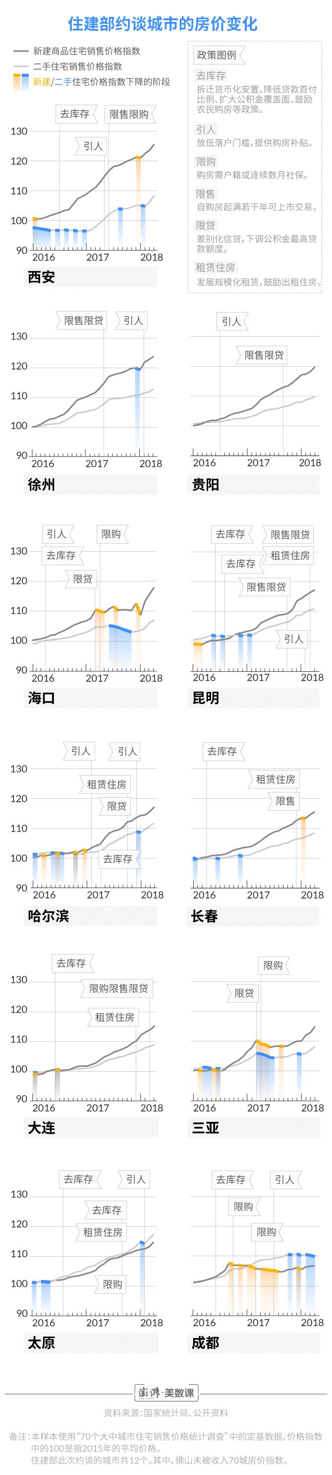 住建部约谈的这些城市,楼市在过去两年经历了什么? 澎湃新闻 图解|住建部约谈的这些城市,楼市在过去两年经历了什么? “五一”前后,住建部就房地产调控问题约谈了12个城市,各地楼市迎来调控密集期。 根据国家统计局发布的70个大中城市“新建住宅价格指数”、“二手住宅价格指数”,澎湃新闻()整理出被约谈城市的房价数据,并将房地产调控政策分为“去库存”、“引人”、“限购”、“限售”、“限贷”、“租赁住房”六类,带你看本轮楼市波动。 看完整体情况,我们来探讨几处有意思的细节。 限制型政策(包括限购、限售、限贷)出现效果分化。 限制型政策有时能让楼市降温,或导致房价下跌,或让涨速放缓。比如2016年10月、2017年3月,成都出台限购政策后,新房房价下跌,二手房房价仍上涨,但涨速放缓。但也有城市出现了调控失灵的状况。比如2017年10月,昆明出台限售政策后,昆明的新房价格环比上涨明显加快,达到1.19%,次月,环比上涨2.62%。 人才引进政策往往在限售限购前后发布。 政府开展人才引进往往配合限购限售等补丁政策,防止投机客借此炒房,维持房价稳定健康。比如,2017年5月,西安曾发布“人才新十三条”,对高端人才大开绿灯,房价上涨明显加快;2017年6月,西安出台限购限售政策,房价上涨立即放缓。再比如,2018年初,昆明相继发布“推动落户”和“限售限贷”的两份政策,发布前后昆明房价处于较平稳状态。 去库存政策出现频率最高,但高峰已过。 本轮被约谈的城市中,有8个曾发布过去库存政策。其中,成都、大连、太原、长春、海口等5个城市发布过一系列去库存政策,昆明、哈尔滨、西安等3座城市发布过棚户区改造推行货币化安置的专项政策。但去库存政策的发布时间集中在2016年至2017年,在被约谈的12城中,今年没有一个城市发布此类政策。 截至目前,上述被约谈的城市已经有4个做出调控回应,新一轮的调控效果,仍待时间检验。
