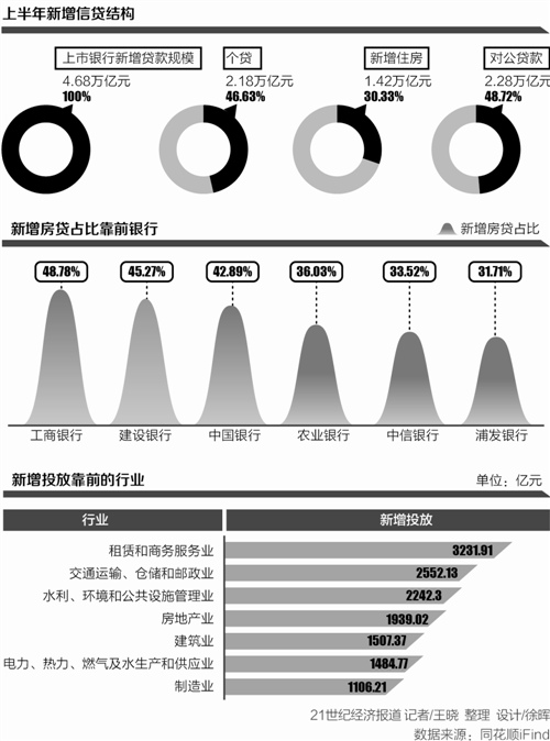 随着上市银行中报的披露,21世纪经济报道记者统计了24家A股上市银行(暂未统计)的新增信贷投放情况。数据显示,24家A股上市银行上半年新增贷款规模达到46830.87亿元,其中个贷占比46.63%,对公贷款占比48.72%。随着监管部门严监管防止资金空转,票据贴现规模持续萎缩。 工行还介绍,交通运输行业主要是满足公路、城市轨道交通等基础设施建设融资需求;水利、环境等主要是支持新型城镇化建设、环境保护和公共服务等领域的重大项目和民生工程。 上述国有大行人士表示,基建和民生项目多还是有政府信用的项目,也是各行投放的重点。房地产业和建筑业新增投放分别为1939.02亿元和1507.37亿元。房地产是农行贷款占比上升最多的两个行业之一。农行称,推动法人房地产业务健康发展。区域结构上,按照“因城施策”原则,重点支持一线城市住房项目;客户结构上,重点支持总行直接准入类客户;产品结构上,重点支持棚户区改造、保障性安居工程项目,从严控制宾馆酒店、商业地产、商品流通市场开发项目。上半年法人房地产贷款新增563.81亿元,棚户区改造贷款新增924.22亿元。 监管部门持续对嵌套较多、杠杆较高的同业、理财和表外等重点领域实行高压政策,信贷回归表内现象明显。央行发布的上半年社会融资规模增量统计显示,上半年对实体经济发放的人民币贷款占同期社会融资规模的96.3%。 各行均表示,积极贯彻落实房地产调控政策,支持居民合理购房需求。农行副行长郭宁宁在中期业绩会上披露,在新增住房贷款中,投向三四线城市的占比提升达56%,二线城市持平为36%,一线城市占比下降至9%。 备受市场关注的新增按揭贷款在新增贷款中占比为30.33%,这一水平与2015年年末水平接近,显示按揭贷款增速明显回落。按揭贷款在个贷中占比为65%,个人消费贷款和个人经营贷款均衡发展。不过有资深银行业人士提醒,要警惕个人经营贷变相流入房地产市场。 农行行长赵欢在中期业绩会上也介绍,该行上半年新发不良60%在传统低端制造业,其次是批发零售业15%,房地产行业不良有所反弹,占比近9%。 批发和零售业,采矿业,公共管理、社会保障及社会组织业是新增贷款减少最多的行业。其中批发和零售业贷款减少999.97亿元。这或许与其行业的不良高发有关。建行中报显示,批发和零售业在所有行业中不良率最高,达到7.37%,制造业和采矿业紧随其后,不良率分别为6.59%和4.62%。 政府项目受青睐 四大国有大行凭借其网点和资金优势,在按揭贷款市场份额中占比领先。上半年四大行新增按揭贷款10751.62亿元,市场份额达75.70%。 结果显示,银行业新增投放最靠前的行业分别是租赁和商务服务业,交通运输、仓储和邮政业,水利、环境和公共设施管理业,房地产业,建筑业,电力、热力、燃气及水生产和供应业,制造业。 |