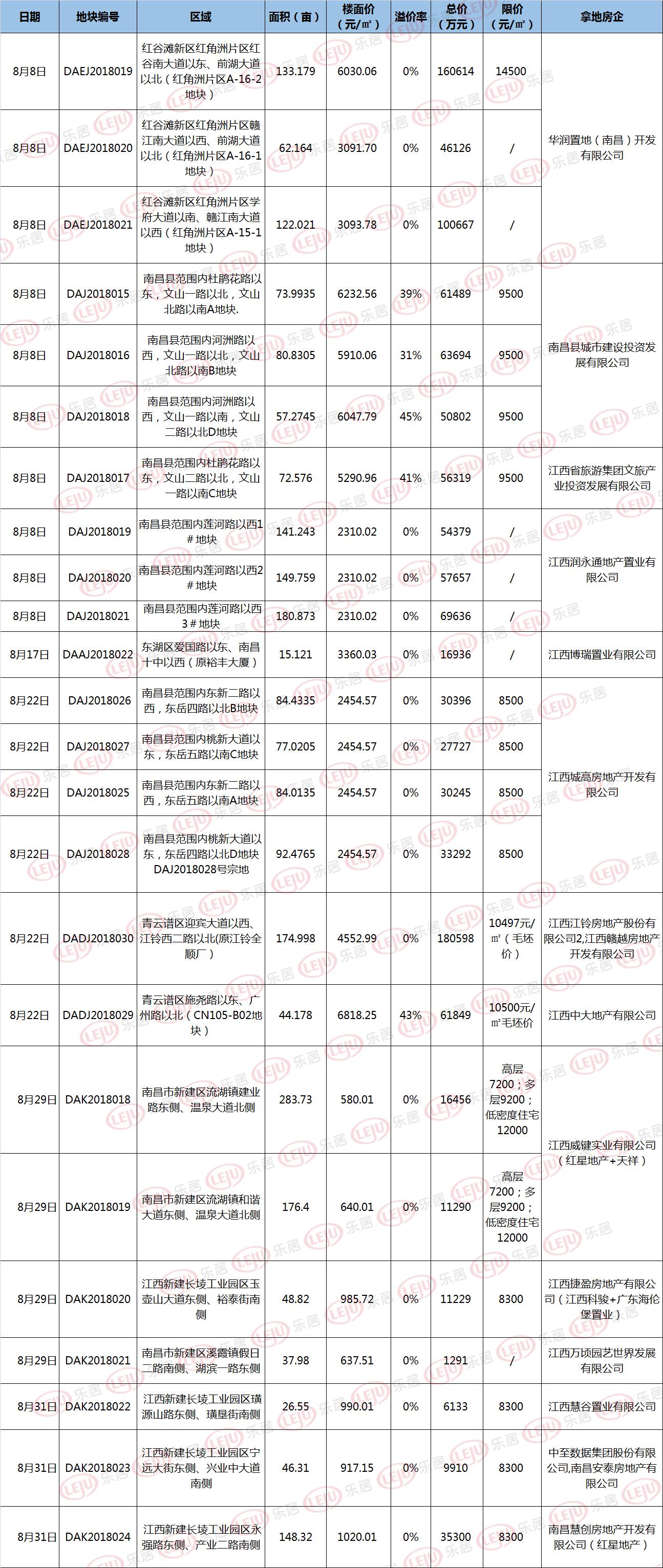 据乐居江西整理统计,2018年8月,南昌市(含赣江新区、南昌县,不含进贤县、安义县,下同)共成交24宗经营性非工业用地,成交面积约2414.26亩,成交总金额约119.40亿元,而2017年8月,这组数字仅为3宗地、31.99亩、2.19亿元。 考虑到每年每个月度的土地供应节奏有所不同,按照前8个月南昌市土地成交总体情况看,截止8月31日,2018年南昌经营性土地(非工业用地)共成交70宗,成交总面积6165.48亩,成交总金额266.45亿元,三项指标同比去年均上涨,其中成交面积大幅上涨72.66%,可见南昌土地供应力度在今年加大。 从月度成交走势来看,在南昌政府提出2018年市本级要在现有的年度住宅用地计划供应规模3900亩的基础上再增加50%的供应量之后,南昌土地市场连续三个月呈现“高潮”,8月达到最高潮。截止目前,8月份的土地成交量达到今年最高峰,当月土地成交了2414.26亩,占今年前八月总成交的40%。土地供应量的大幅增长,将改善南昌新房库存的不足。 九龙湖6宗地“打包”流拍 本月土拍中,最令人关注的是,九龙湖6宗优质地块“打包”流拍。8月24日,九龙湖新城江西国际贸易金融港6宗地共计296.9亩地流拍。 据公示显示,这6幅地块须由同一家房企竞得,其中两块商业商务用地,3块纯居住用地,以及一块商业商务居住用地,为江西国际贸易金融港的定制地块。 这6块曾于今年6月挂出,本应于6月27日拍卖,却在25日终止拍卖,而今地块编号修改后重新拍卖,地块各项指标并未有变,包括限价,却遭遇流拍。 八成为“定向出让” 据乐居江西梳理,在8月成交的土地中,有18宗地共1910.414亩分别设置了较为严苛、细致的土地出让条件,占月度总成交面积的80%。 例如,月初的国展中心地块,竞买人或其实际控制人为世界500强排行榜中位列前100位(2016年度《财富》杂志公布)且该实际控制人旗下具有中国连锁企业百强排行榜前50强的企业(2016年度中国连锁经营协会公布),符合这两个要求的,只有华润。 月底望城四宗地的出让要求中,均是与产业挂勾的定向出让,DAK2018020地块须建设国际化ARVR科创产业城;DAK2018022地块须建设不少于2万平方米的智能制造产业总部基地项目;DAK2018023地块宗地竞买人(或其母公司)须获得由江西省文化厅颁发的“江西省文化产业示范基地”;DAK2018024地块宗地竞买人(或其母公司)须为2017年中国商业地产主要优秀企业前10名,且须为中国房地产百强企业综合实力前50强,须自持大型家居建材商场约5万平方米10年以上。 这些出让条件可谓是围绕竞买人制定的竞拍门槛,即勾地。所谓勾地,指土地在正式挂牌出让前,由单位或个人对感兴趣的土地向政府表明意向并出价,在政府认可其出价后,再行挂牌、招标、拍卖的交易方式。而“勾地”是完善现行土地出让制度的一种努力,或将成为常态。 以下为8月南昌土地成交详情 |