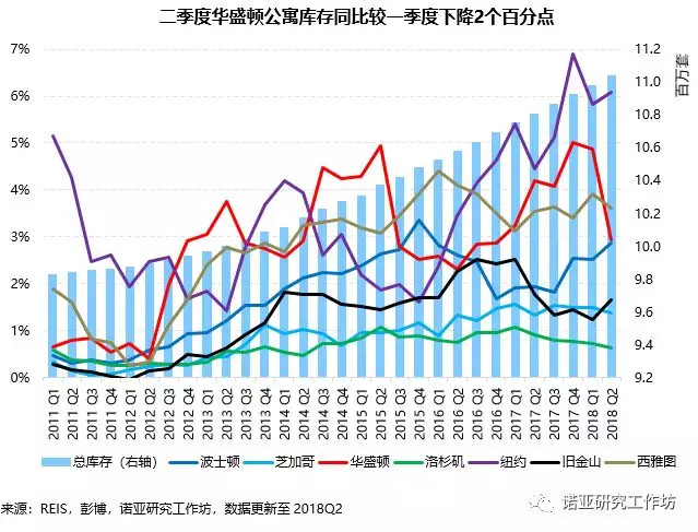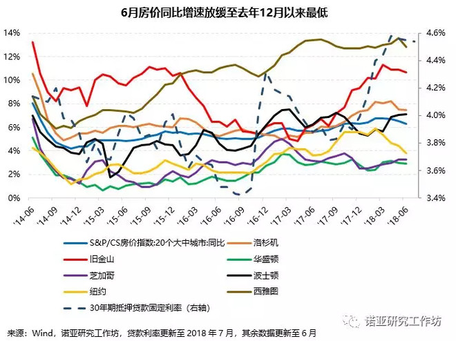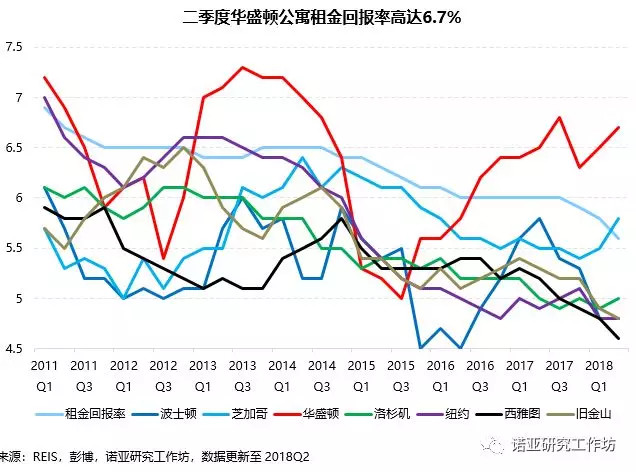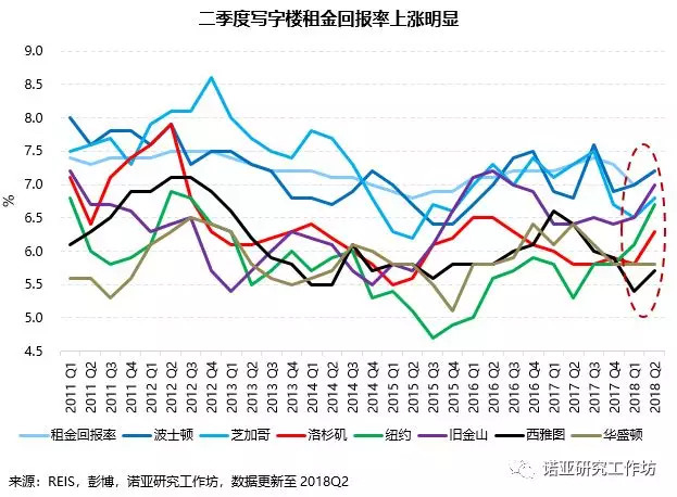 文/诺亚研究工作坊 1. 在抵押贷款利率上升等限制性因素影响下,住宅需求出现疲软迹象,商业地产表现优于住宅。 2. 中国一线城市租金回报率在2%以下,美国主要城市公寓回报率虽然略降至5.6%,但相比较而言仍有很大吸引力。 3. 写字楼直接受益于经济强劲增长,二季度表现转好,工业地产受益于电子商务的迅速发展,成为商业地产最活跃的板块之一。 正文 (一)美国住宅市场出现疲软迹象 7月30年期抵押贷款固定利率为4.54%,比6月的4.58%略下降0.04个百分点,但仍处于7年以来最高点。 在抵押贷款利率上升等限制性因素影响下,美国6月楼市需求疲软,标普 CoreLogic Case-Shiller 周二公布的数据显示,6月美国20个城市的房价同比增速放缓至6.3%,比5月的6.5%下降0.2个百分点,为2017年12月以来最低。 美国全国房地产经纪人协会表示,由于供应紧张和价格上涨,7月份现房购买量降至两年来的最低水平。美国政府数据显示,新房市场出现类似趋势,销售跌至9个月低位。 城市方面,西雅图6月房价同比上升13%,比5月的14%下降1个百分点,但仍领先20个大中城市涨幅。波士顿6月房价同比上升7%,芝加哥上升3%,均同前值持平,其余主要城市房价增速均有所放缓,其中,纽约房价同比已由2月的6%下降至6月的4%,而且是20大中城市里唯一环比下降的城市。 虽然强劲的就业市场和消费者的乐观情绪继续支撑主要城市的房地产市场,房屋空置率呈下降趋势,6月低至1.5%,出租房空置率为6.8%,降至2016年7月水平,但是抵押贷款利率接近7年来的高位,楼市供给不足,工资增速也不温不火,导致房地产市场出现疲软。 (二)与中国相比,美国公寓租金回报率仍有很大吸引力 二季度公寓总库存约为1.1千万套,同比增加2.1%,环比小幅增加0.5%,净吸纳量约4千套,环比增加11%,同比降幅缩小至6.7%。 洛杉矶库存同比增加0.6%,芝加哥库存同比增加1.4%,自2013年以来增速缓慢平稳。波士顿公寓库存自2017Q3以来增速显著增加,由1.8%增至2.9%,恢复到2016Q1的增速水平,接近2015Q4最高水平3.4%。华盛顿公寓库存增速下滑显著,同比增速2.9%,比一季度的4.9%下降2个百分点,回落到2016Q4增速水平。 公寓租金回报率在金融危机后急速增长,由2008Q3的6.3%增至2009Q4的7.4%,之后呈缓慢下降趋势,今年二季度下降至5.6%,比一季度的5.8%略微下降0.2个百分点,中国一线城市租金回报率在2%以下,整体回报率普遍低于4%,相比而言美国公寓投资仍有很大吸引力。 城市分化严重,主要城市中华盛顿和芝加哥回报率自去年三季度开始迅速,扭转之前的下降趋势,华盛顿以6.7%的投资回报率领先,且库存同比增速下滑明显,去年哥伦比亚特区人口同比增速为1.4%,高于加州的0.6%和纽约州的0.1%,人口增长强劲,预计短期租金回报率高于平均。 二季度空置率为4.8%,比上季度4.7%略高0.1个百分点,主要城市空置率均有所提高,纽约空置率为5.3%,比上季度降低0.1个百分点,华盛顿空置率升至7%,比上季度增加0.1个百分点,但净吸纳普遍增加,综合租金收益率、库存和人口增长情况来看,空置率提高也并不意味着公寓市场变差。 洛杉矶和旧金山公寓空置率长期低于平均水平,二季度分别为3.4%和4.5%,其中洛杉矶空置率一直维持在3%左右,二季度租金回报率略升至5%。 (三)写字楼市场受益于良好的经济状况,二季度表现转好 今年以来,写字楼市场表现优异,其表现与宏观经济有直接关系,美国二季度GDP增速4.1%,创四年新高,4月失业率下降至3.9%,创18年新低,二季度写字楼市场保持稳定增长,持续的入住率、租金增长以及健康的供应渠道将为租户提供更多选择。 虽然入驻率增长速度放缓,净有效租金可能承压,但稳固的宏观经济和就业增长支撑了租赁需求和投资销售活动。 6月美国建造支出折年数同比上升6.1%,比5月的6.3%下降0.2个百分点,公寓建造支出折年数同比上升10.7%,比5月的17.5%下降6.8个百分点,回落到3月份水平,商业住宅建造支出折年数同比上升1.1%,比5月的2.3%下降1.2个百分点,是2016年1月以来最低点。 不过,写字楼建造支出折年数自去年9月开始反弹,今年2月由负转正,6月同比上升10.8%,比5月的10.5%略升0.3个百分点,这是因为写字楼与宏观经济直接相关,美国二季度GDP增速4.1%,创四年新高,4月失业率下降至3.9%,创18年新低,强劲的经济带动写字楼需求旺盛。 二季度租金回报率为7.2%,比上季度的7%提高0.2个百分点,结束下降趋势,主要城市租金回报率有明显提升,纽约升至6.7%,为6年来最高水平。受益于良好的经济状况,预计写字楼市场表现将继续转好。 由于交付量增加,二季度空置率上升至16.6%,比一季度略微上升0.1个百分点,供给量增长速度大约是入驻速度的两倍,我们预计供需形势将在未来几个季度缓慢转变。 整体来看写字楼空置率较平稳,7年内波动不超过1%。纽约空置率为8.3%,比一季度上升0.4个百分点,但仍是主要城市中最低,旧金山和西雅图近几年空置率下降明显。 从仲量联行的“写字楼时钟”图可以看出,芝加哥和华盛顿的写字楼市场已经进入成熟期,波士顿、洛杉矶、西雅图等大部分城市正处在鼎盛时期,发展稳定且投资回报率高。 (四)电子商务带动工业地产,成为商业地产最活跃的市场之一 电子商务的巨大增长已经显着改变了工业市场,成为商业地产领域最活跃的市场之一。 根据一项电子商务研究,2017年美国零售电子商务销售额增加4092亿美元,而去年同期为3603亿美元,增长超过16%,预计到2022年,网上购物零售