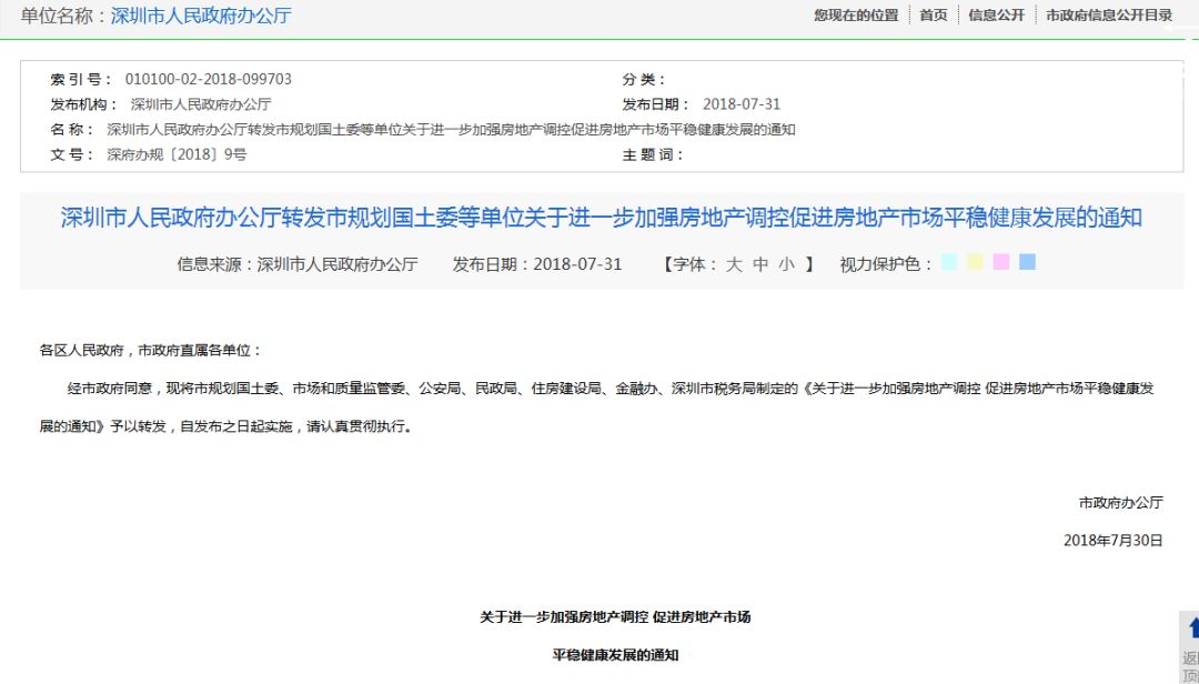 关于深圳楼市,一直以来都是那么引人注目。 就在上周,深圳市规土委一份内部文件《市规划国土委关于进一步加强房地产调控,促进房地产市场平稳健康发展的若干措施的请示》在网络上流出。谁也没想到,就在7月31日,调控政策真的来了。 7月31日,深圳政府在线网站发布《深圳市人民政府办公厅转发市规划国土委等单位关于进一步加强房地产调控促进房地产市场平稳健康发展的通知》。