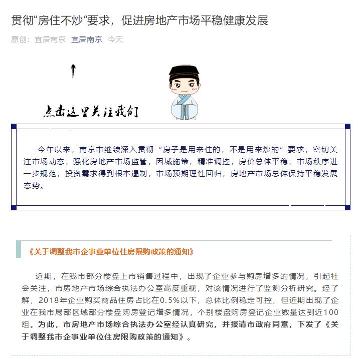 扬子晚报网8月13日讯(记者 马祚波)南京终于出台企业“禁炒令”了!就在上周五南京市房管部门表态称,将对热门楼盘频频出现的大量企业购房的现象“认真研究、优化调控举措”后,本周一,南京市终于出台了《关于调整南京市企事业单位住房限购政策的通知》,从8月13日19时起,在全市范围内暂停向企事业单位及其他机构销售商品住房,这是继西安、长沙、杭州、深圳等城市之后,又一个出台企业“禁炒令”的城市。 一、执行时间自南京市房地产市场综合执法办公室发文之日起,即在2018年8月13日19:00后开始执行,对采取摇号方式销售的楼盘,以房产部门购房资格核验时间为准,对非摇号方式销售的楼盘,以认购协议签订时间为准; 二、执行范围为全市范围; 三、限制购房对象为所有企事业单位以及其他机构,涵盖本市和外地企事业单位以及其他机构; 四、限制购买的房屋为商品住房。 南京市房管部门表示,近期,在南京市部分楼盘的上市销售过程中,出现了企业参与购房增多的情况,引起社会关注,该市房地产市场综合执法办公室对这一情况进行了监测分析研究。经了解,2018年企业购买商品住房占比在0.5%以下,总体比例稳定可控,但是近期出现了企业在南京市局部区域部分楼盘购房登记增多的情况,个别楼盘购房登记企业数量达到近100组。为此,南京市房地产市场综合执法办公室经认真研究,并报请市政府同意,下发了《关于调整南京市企事业单位住房限购政策的通知》。 房管部门指出,今年以来南京市继续深入贯彻“房子是用来住的,不是用来炒的”要求,密切关注市场动态,强化房地产市场监管,因城施策,精准调控,房价总体平稳,市场秩序进一步规范,投资需求得到根本遏制,市场预期理性回归,房地产市场总体保持平稳发展态势。今后将继续贯彻落实国家关于房地产市场调控的要求,更好地满足群众的住房居住需求。 |