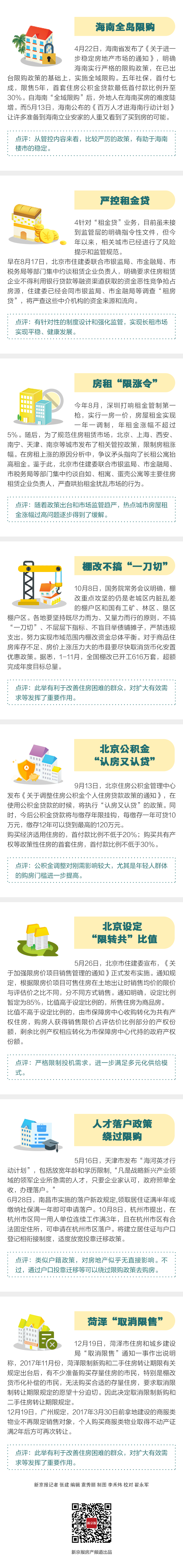 2018年3月,两会上《政府工作报告》提出更好解决群众住房问题,进一步强调“房子是用来住的、不是用来炒的”定位,出台了加快建立多主体供给、多渠道保障、租购并举的住房制度等一系列调控政策。据中原数据显示,截至目前,全国发布房地产调控政策多达400余次,预计全年在450次左右。记者梳理发现,重点政策主要涉及棚改、公积金、贷款、限购等方面。 新京报记者 张建 编辑 袁秀丽 制图 李禾炜 校对 翟永军 |