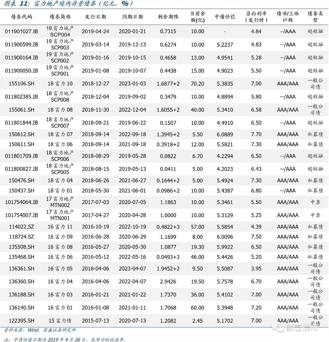 酒店运营业务,酒店数量和收入攀升,毛利率小幅下降,业务持续亏损,关注资产盘活。2018年末,富力运营的酒店达89家,总建筑面积合计为390.36万平方米,房间数目合计为26865间,分布在华北、华南、中南、西北和海南,包括一二线及三四线城市,酒店大多位于所在城市的核心地段。2018年,由于结转并购的万达酒店全年收入,富力酒店收入大幅增至70.28亿,但毛利率由20.39%下降至19.01%。2018年,酒店业务亏损额扩大至4.59亿元,2013-2016年,酒店亏损额分别为2.49亿、1.40亿、1.67亿和1.83亿元。2018年末,酒店账面净值为282.76亿,未来如果进行资产证券化,将有效地盘活资产。 公司土地储备下沉至三四线城市,需关注未来销售情况。富力地产对利润率要求较高,加上以独立开发为主,联合拿地较少,为了提高销售规模,分散式下沉至三四线城市成为其近几年的发展策略。截至2018年末,富力未竣工权益土地储备面积为6073.22万平方米。其中,一线城市和二线城市占比分别为4.17%和37.45%,而三四线占比达58.38%。一线城市中,广州和北京土储占比较高。二线城市中,太原、重庆和天津占比排名前3位。 我们进一步对三四线城市分省份分析,土地储备分散分布在19个省份,其中,广东、内蒙古、海南和湖南占比较高。我们将除省会城市、GDP排名前2位之外的城市归为其他城市。除了内蒙古、海南、江西、贵州和新疆,其他省份的土储均分布在其他城市。随着货币化棚改的退潮,经济相对较弱、人口净流出或者人口基数较小的三四线城市房地产销售将承压,需关注富力未来的房地产销售情况。 3. 债务:2018年净负债率上升,短期偿债压力增大,银行授信较充裕2018年有息债务和净负债率均上升,短期偿债压力增大。2014-2018年,公司有息债务持续攀升,18年末达1633亿元,净负债率上升至184.15%,杠杆水平较高。从短期偿债压力看,2018年短期债务占比由17年19.64%上升至32.06%,而货币资金\/短期债务由17年的113.37%下降至66.3%,2019年短期偿债压力较大。 负债以银行借款和境内债券融资为主,银行授信较充裕。2018年末,公司有息债务中,银行贷款、境内债券融资、离岸美元优先票据、信托贷款及其他分别占比52%、25%、12%和11%。从银行贷款看,2018年未使用银行授信由16年的880.3亿增至1303亿,银行贷款融资空间相对充足,2015-2017年,银行贷款组合实际利率持续下降,2018年回升至5.36%。从境内债券融资看,16-18年末以及19年1季度末,存量债余额分别为490亿、510亿、402亿和500亿,债券融资相对可持续。但18年以来发行超短融较多,发行金额为129.7亿元,占18以来发行债券总额的47.6%,存在短贷长用风险。 公司以独立开发为主,少数股东权益占比很低,受限资产占比较高,或有负债风险相对较小。由于公司以独立开发为主,少数股东权益占比很低。2015-2017年,公司少数股东权益\/所有者权益低于1.5%,2018年少数股东权益\/所有者权益为2.31%。从受限资产占比看,2016、2017年,公司受限资产\/净资产分别为152.64%、124.82%,高于同行标杆房企。从或有负债看,公司对外担保以购房人按揭贷款担保为主,2018年末购房人担保占比为92.72%,关联方担保较少,或有负债风险相对较小。 截至2019年4月26日,公司境内存量债共25只,余额合计500.15亿元,包括超短融、私募债、一般公司债和中票。其中,有12只债将于2019年到期或回售,合计199.7亿;有8只债将于2020年到期或回售,合计105.25亿,到期及回售压力较大。2018年上半年,公司存量债估值持续上行,“16富力09”一度超过8%。2018年11月至今,公司存量债估值下行90bp-200bp,目前多数估值在5%-6%区间。 |