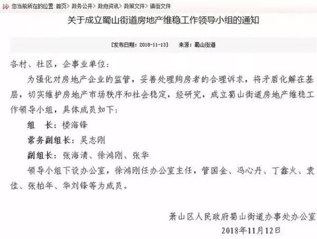 杭州成立全国第一个“房地产维稳小组” 据澎湃新闻网报道,浙江省杭州市萧山区政府网站透露,11月12日,萧山区蜀山街道办事处办公室发布关于“成立蜀山街道房地产维稳工作领导小组”的通知。