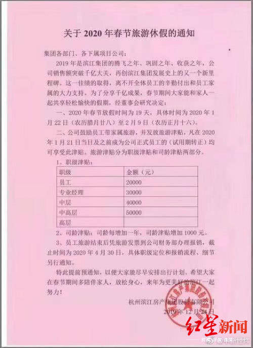 图据网络 红星新闻记者通过网上流传的这张粉底黑字的通知图片中看到,通知落款为杭州滨江房产集团有限公司(以下简称滨江集团)。 红星新闻记者拨通了滨江集团的官方电话,工作人员称,这个福利通知是昨天发的,19天假期和旅游津贴都是真的。 对方称,目前整个集团房产板块的员工有900多人,主要因为滨江房产销售今年破千亿,所以房产板块的员工能够享受这个福利。 红星新闻记者拨通了滨江集团的官方电话,工作人员称,这个福利通知是昨天发的,19天假期和旅游津贴都是真的。 对方称,目前整个集团房产板块的员工有900多人,主要因为滨江房产销售今年破千亿,所以房产板块的员工能够享受这个福利。 此外,她提及,去年滨江集团房产板块的员工是700多人,今年增加到900多人,“因为这两年滨江的业绩一直在上涨,所以员工也在同步增加。” 滨江集团旗下楼盘杭语蓝庭的一名不愿透露姓名的置业顾问告诉红星新闻,这份通知是真的,他们也已看到了相关的新闻报道。 她说她来公司已经4年了,“我进公司这几年基本每年都有(福利),2016年国内游,我去的是拉萨,全程费用都报销。2017年公司25周年庆,是国外游,我去的是美国,也是全程报销,还额外给了1000美元每人。” 杭语蓝庭另一名置业顾问则对红星新闻表示,滨江集团作为杭州本土企业,口碑一直很好。他称,滨江集团是杭州豪宅的领先者。值得一提的是,近日被人广泛关注的杭州武林壹号总价6876万的法拍房就由滨江集团旗下房产公司开发。