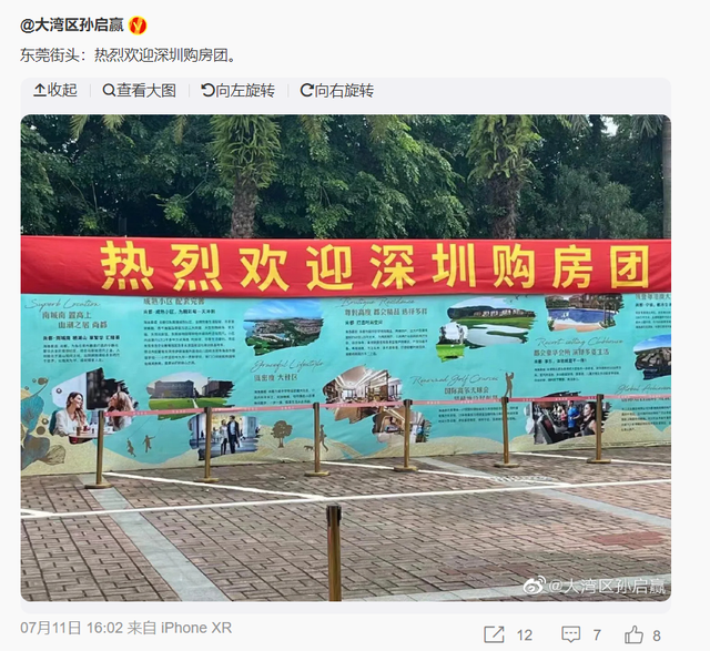 有楼盘推出“0.5成首付”,有售楼处拉横幅“热烈欢迎深圳购房团”!新政一周,这个城市楼市“火”了 “热烈欢迎深圳购房团”。 东莞楼市调控新政发布一周,当地项目对于深圳客的欢迎之情溢于言表,横幅已经在售楼处拉开。 7月4日,东莞发布了除东城、南城、莞城、松山湖等区域外的全域取消限购政策。此后一周内,《每日经济新闻》记者注意到,除上述楼盘紧急打出此类宣传横幅外,还有楼盘推出了“首付0.5成买房,剩下1.5成直接送”海报。 7月12日,一位东莞资深地产人士在接受《每日经济新闻》记者微信采访时表示,近期东莞市场成交量明显变多,新政释放了部分积压的因个税、社保达不到条件的购买力,预计后续市场还会持续上涨。