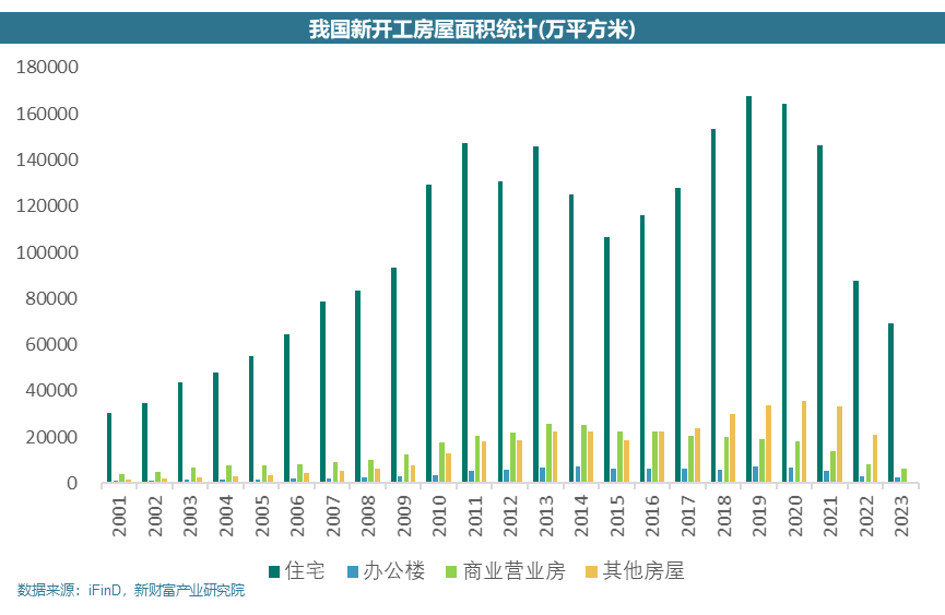 行业目前竞争趋势1.以住宅为主的民营设计房地产产业前景院迅速衰落疫情以来,在经济不佳+房价高位+人均居住面积不断提升的多重影响下,导致22年、23年新开工住宅面积在肉眼可见的下降以新建商品房设计为主营业务的民营设计院业务量迅速萎缩,如:天华、联创、铂涛等等,该类建筑设计公司在A股均未上市。