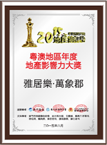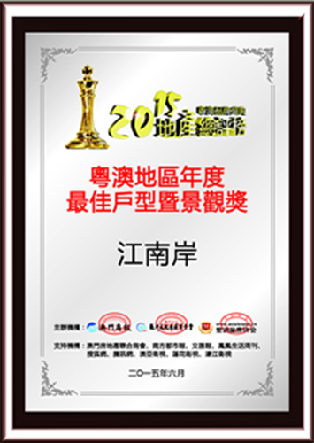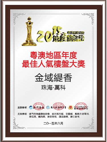 獲得“粵澳地區年度最佳城市綜合體”殊榮的是:————心海州 獲得“粵澳地區年度地產影響力大獎”-----雅居樂·禦龍山 獲得“粵澳地區年度最佳人氣樓盤大獎”殊榮的是:————-珠海·萬科金域緹香 “典範”不好做,因為這意味著更大的能力與更多的責任。前山河畔,當巔峰人士邂逅濱河豪宅,二者一見傾心,傳出一段門當戶對的豪門佳話,毫無懸念;而“影響有影響力的人”,顯然符合它一貫的“擇偶”標準。 日出江花紅勝火,春來江水綠如藍。這是唐代著名詩人白居易的《憶江南》。走在這個專案裏,步步有江南,處處江南景。在戶型設計上,戶戶朝南,方正實用,設置私人9米闊景陽臺,讓白藤湖水鄉美景盡收眼底。 獲得“粵澳地區年度粵澳濱河人居典範獎”殊榮的是:————-中信·紅樹灣 在本屆粵澳地產總評榜中,共有41個樓盤參與了本次評選,經網路公開投票和專家評委團的公平的評審,評出2015年的“粵澳品牌盛典·地產總評榜”,獲獎名單如下: 1984年,萬科誕生於中國深圳;1991年萬科A股在深交所掛牌交易;2010年,萬科成為全球首個超1000億銷售額的地產開發企業;而今年——2015年,萬科繼2010年上海世博會後再度亮相米蘭世博會,成為世博會163年曆史上首家以海外獨立建館形式參展的中國企業。萬科金域緹香具備三個價值點:1、一步珠澳,距離澳門近;2、拱北大宅,屬於拱北片區,系高質量的住宅專案;3、4A景區物業,意味住萬科金域緹香擁有國家4A景區的稀缺自然景觀及配套資源,十分值得關注。 它是國家級生態保護區——中山五桂山生態保護區內的唯一法式建築,不僅沐澤生態保護區天然氧吧的富氧離子與旖旎風光,還細緻詮釋了地道的法蘭西風情。1500多種植物,300多種動物,90%以上的森林覆蓋率以及方圓300多平方公里的常綠植被,時不時提醒著澳門各界大佬們,這裏正是可遇而不可求的“粵港澳頂級豪宅區”。