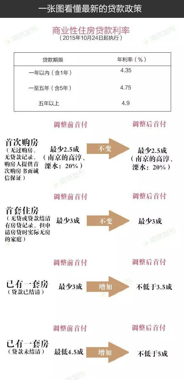 调整商品房贷款首付比例方面 首套房仍按前期政策首付25%(高淳、溧水20%)不变;对拥有1套住房且相应购房贷款已结清的居民家庭最低首付款比例调整为不低于35%(除高淳、溧水);对拥有1套住房且相应购房贷款未结清的居民家庭最低首付款比例调整为不低于50%(除高淳、溧水) 具体如下图显示: