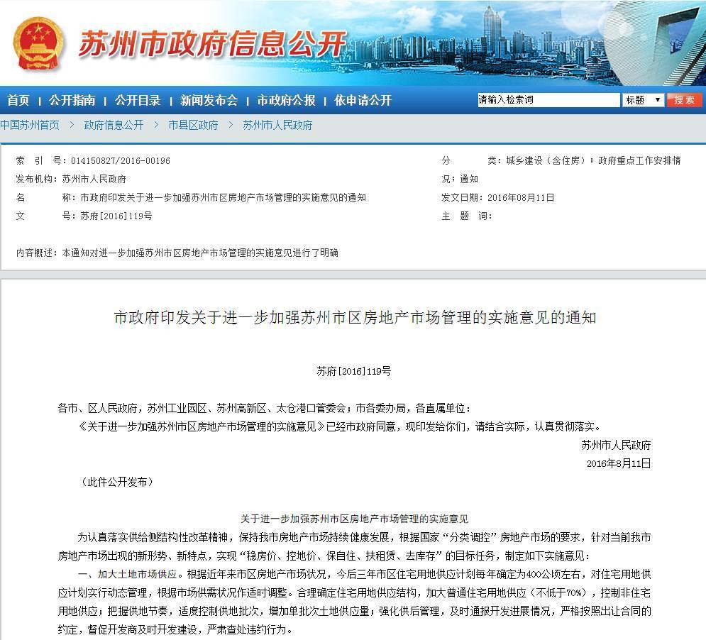 2.已有1套住房、但没有购房贷款记录的居民家庭; 1.有购房贷款记录、但申请贷款购房时实际没有住房的居民家庭; 8月9日下午,合肥各银行放出贷款新细则:合肥房查有2套房,征信有一笔住房贷款未结清的,拒绝贷款,较之之前的按6成首付贷款有所收紧。目前,部分银行业内人士已经确认这一细则正在执行。 今天(11日)苏州市政府新出台了《关于进一步加强苏州市区房地产市场管理的实施意见》。 合肥收紧信贷 三是引导土地出让理性竞价。文件明确对区位优势明显,市场竞争力强的部分住宅地块,土地出让时会设定并公布市场指导价,出让成交价格超过市场指导价时,在出让文件中明确全额出让金缴付期限缩短为2个月。 一是规定经营性用地公开出让实行网上交易,竞价所产生的保障房建设资金不计入房价准许成本。 具体要求为:非本市户籍居民家庭申请购买第2套住房时,应提供自购房之日起前2年内在苏州市区累计缴纳1年及以上个人所得税缴纳证明或社会保险(城镇社会保险)缴纳证明。开发企业在签订购房合同时应认真审核购房人资格,购房人违反限购规定或购买超过2套住房的,登记部门不予办理产权登记手续,开发企业或购房人承担相应的经济和法律责任。 对出让成交价格超过市场指导价的不同幅度,明确差别化调整商品住房预售许可条件,即土地出让成交价超过市场指导价(不含市场指导价)的,工程结构封顶后方可申请预售许可;土地出让成交价超过市场指导价10%(不含10%)的,工程竣工验收后方可申请预售许可。而当公开出让网上报价超过市场指导价25%以上时,中止网上竞价,转为网上一次报价方式确定土地竞得人,由竞买人在超过土地出让市场指导价25%以上再作一次报价,以一次报价中最接近所有一次报价平均价的原则确定竞得人,以其所报价格确定为地块竞得价格。具体报价规则另行制定,近期将会与土地出让公告同步发布。 非苏州户籍居民购房有哪些限制?