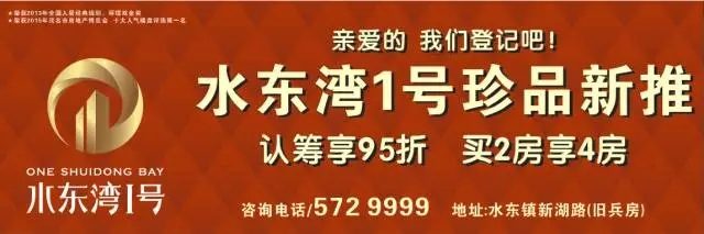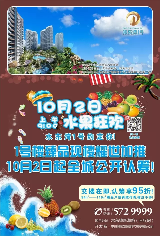 荣富水东湾1号 超高面积赠送 除了美食,还有好多好玩的游戏 谁都想有一套!!! 茂名独此一家! 水东湾1号豪装样板房! 五星红旗迎风展,树清水秀秋日朗。 水东湾1号采用错层跃式超高超大阳台设计,阳台层高达6米,最长达13.1米、最大进深达3.7米,拥有270°无遮挡景观阳台。超大海景+湖景+园景多重景观视野。93~119平方米金牌海景户型。超低价/高赠送/三重景观户型,赠送高达54平方米,全城最抵买,眼见为实,见证最美户型! 【地址】茂名市电白区水东镇新湖路(旧兵房) ★荣获2013年全国人居经典规划、环境双金奖 ★29万平方米巴厘岛风情园林社区 2016年10月1日前,凡亲临水东湾1号营销中心参观登记,即可免费领取10月2号《水果乐狂欢》活动美食券1张! 最合理的价格 同时拥有 (水东湾1号工期最新进展) 【开发商】电白县荣富房地产发展有限公司 远不止以下这4款哦 荣富地产全体员工恭祝: 券是长这样的! 【水东湾1号】1号楼新品现楼认筹盛大启动! ★29万平方米巴厘岛风情园林社区