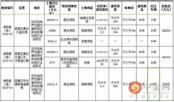 据业内人士称,该地块同时打破了天津环城(西青区、东丽区、津南区、北辰区)土地成交的楼面价最高纪录。 根据资料显示,该宗地块编号为津西青(挂)2016-02号宗地,位于天津西青区张家窝镇赛达大道北侧,出让面积约19.21万平方米。其中,城镇住宅约16.5万平方米,容积率1.01-2.0,建筑密度不大于25%,绿地率不小于45%,建筑限高80米;商服约2.06万平方米,容积率不大于2.0,建筑密度不大于30%,绿地率不小于35%,建筑限高40米;街巷6022.4平方米,起始价格为38.28亿元。这也是今年以来西青区出让的第三宗宅地。