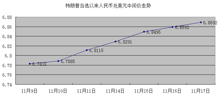 上周特朗普当选美国总统,意外大幅推高美指,相应给人民币施加贬值压力,香港离岸人民币一度跌破6.89元关口,人民币兑美元即期也逼近6.88。人民币中间价罕见十一连跌,且最近11个交易日,人民币即期、离岸人民币和中间价都下跌逾千点,跌逾1.6%! 这两个是说汇率和房价变动存在相互替代的关系。就是说,汇率贬值多,房价下跌的压力就减轻;反过来,房价下跌多,汇率贬值的压力就减轻。第二个视角是金融视角,把房价和汇率看成是资产价格。金融视角最常见的就是资产配置视角。房价上升太多,本币资产占总财富的比例可能超过理想的范围,大家就更愿意去换外币资产,带来资金留出压力。