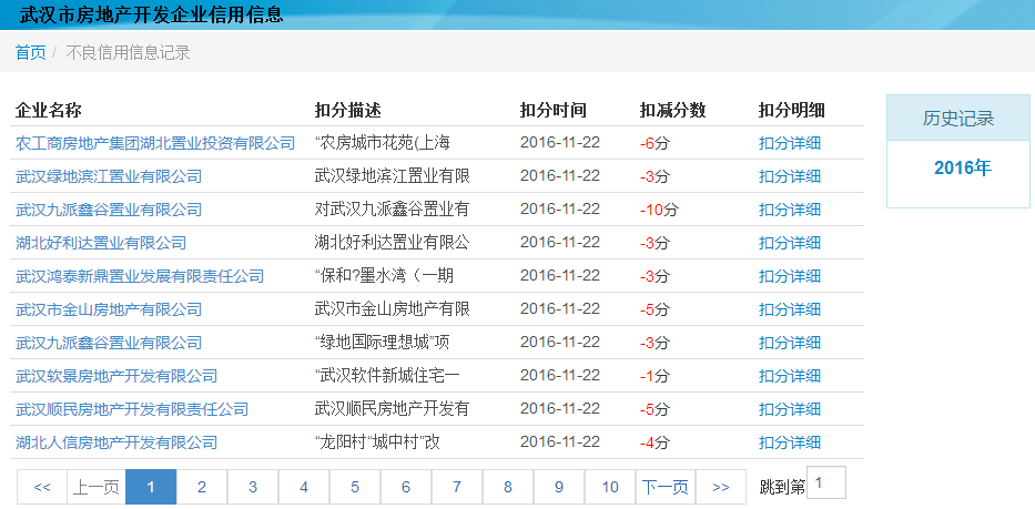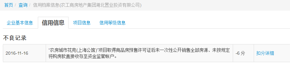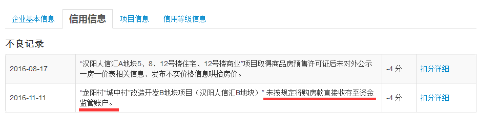 11月22日,武汉市房管局又曝光10家违规房企,多个品牌房企上榜。 图片来源:武汉市房管局官网 新增名单中,被扣分最多的是武汉九派鑫谷置业有限公司,被主管部门下达行政处罚决定书,一次扣10分。被罚的具体事由是武汉九派鑫谷置业有限公司开发建设的“绿地国际理想城”项目商品房项目未取得《商品房预售许可证》,提前收取购房人购房款。 11月16日,武汉房管局发布《武汉市新建商品房预售资金监管实施细则(征求意见稿)》,进一步明确和细化新建商品房预售资金监管工作。此次曝光的违规房企中,多个房企因未按规定将购房款直接收存至资金监管帐户而扣分。 农房城市花苑(上海公馆)项目扣分明细 汉阳人信汇B地块扣分明细 为规范房地产市场秩序,武汉于今年年初建立了房地产开发企业信用档案和信用信息公示平台,将房企违法违规销售行为记入信用档案。截至11月23日,武汉共有132家房地产开发商或项目登上了武汉房管局的“诚信黑榜”。 根据规定,每家信用基础分100分,无证销售、囤积房源、捂盘惜售等行为列入扣分,累计扣减后得分低于60分,或一年内同类违法违规3次以上,纳入“警示名单”重点监管,并作为降低或注销资质的依据。截至目前,尚无房企进入“警示名单”。 |